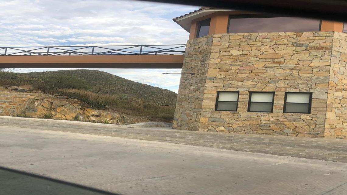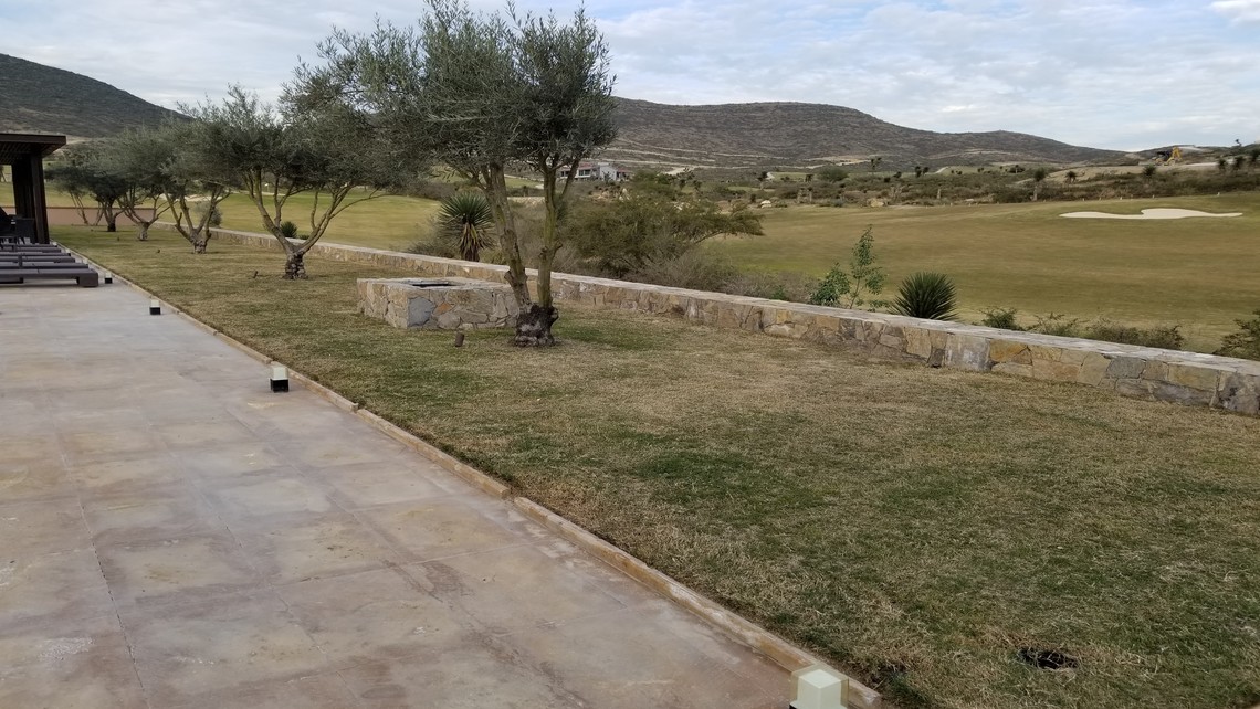 En esta área se coloco el piso de cantera tipo madera con un sellador tipo húmedo, se colocó un marco de cantera en los ventanales y arcos, se fabricaron anuncios de cantera labrada, la cascada se fabricó con mármol y los costados de piedra hoja seca, muros de contención de piedra hoja seca.